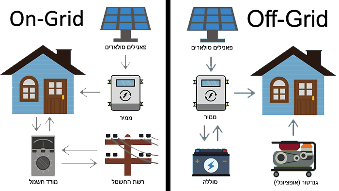 מערכת אנרגיה סולארית מחוץ לרשת (off-grid) אינה מחוברת לרשת חברת החשמל, ואילו מערכת אנרגיה סולארית (on-grid) מחוברת לרשת חברת החשמל. הבחירה שלך במערכת מחוץ לרשת או במערכת ברשת תקבע את הגישה שלך לחשמל, איזה ציוד נדרש לייצור עודף, מה קורה כשהרשת יורדת וכיצד תחויב בגין חשמל.