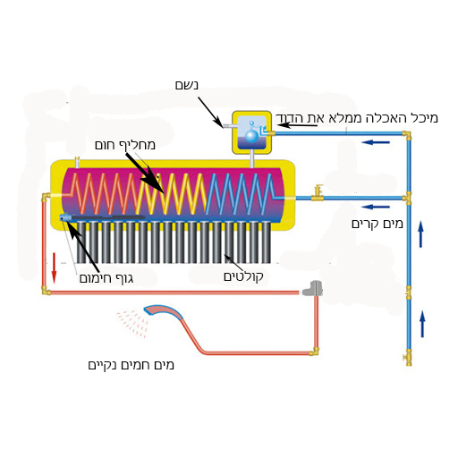 מחליף חום זה ספירלה גדולה שנמצאת ביתוך מיכל המים, מי הצריכה עוברת דרך הספירלה ולא מתערבבת עם המים החמים שנמצאת בתוך המיכל אבל המים החמים מחממים את הספירלה והספירלה מחממת את מי הצריכה וכך הצרכן מקבל מים חמים נקיים